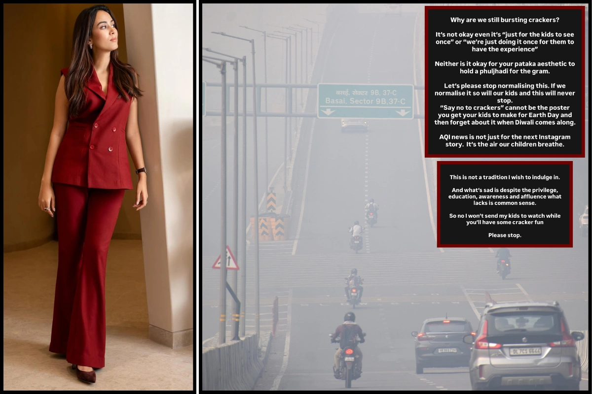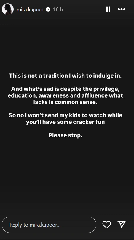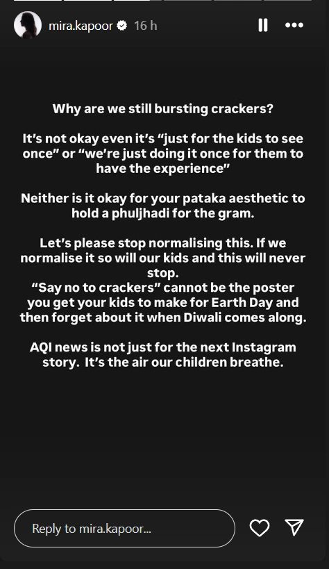 Mira Rajput Kapoor, wife of Bollywood actor Shahid Kapoor, questioned the continued use of firecrackers despite rising pollution levels through her social media platform.