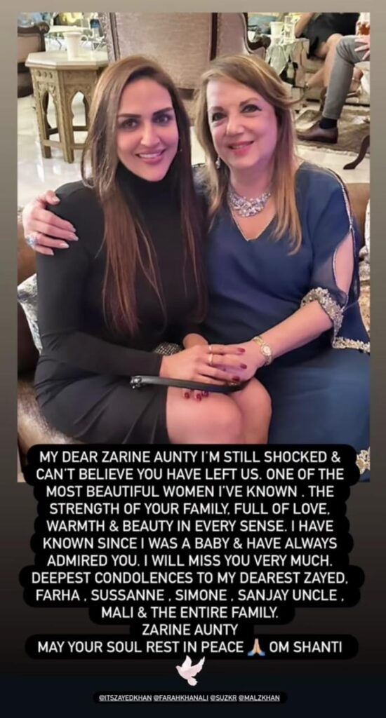 Esha extended condolences to the entire Khan family, including Zayed, Farha, Sussanne, Simone, and Sanjay Khan. She concluded her post with, “Zarine aunty, may your soul rest in peace. Om Shanti.”