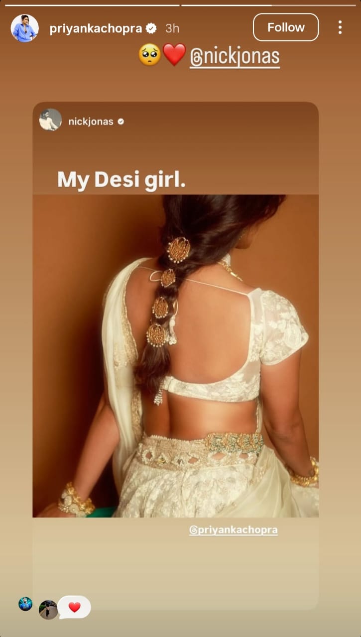Priyanka reshared the post on her Instagram Stories, responding with a tears-of-joy emoji and a red heart, reflecting her emotional reaction.