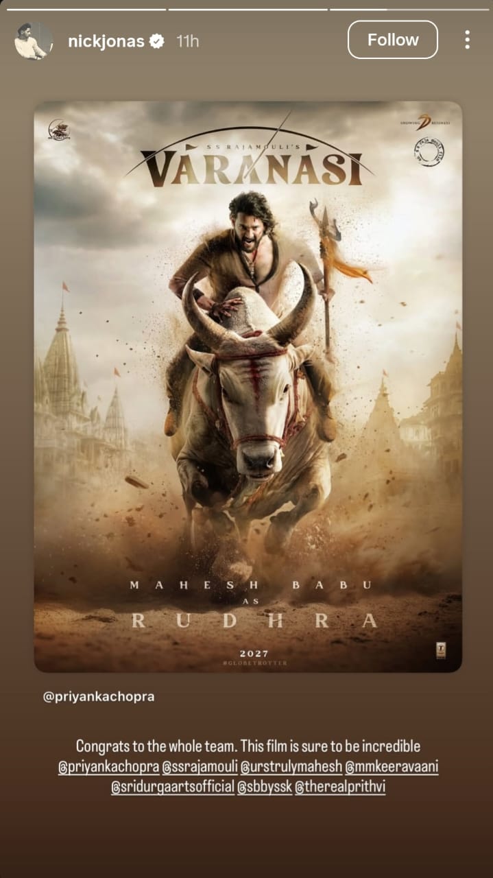 In a separate post, Nick also sent his congratulations to the cast and crew of Varanasi after viewing the film’s initial teaser.
