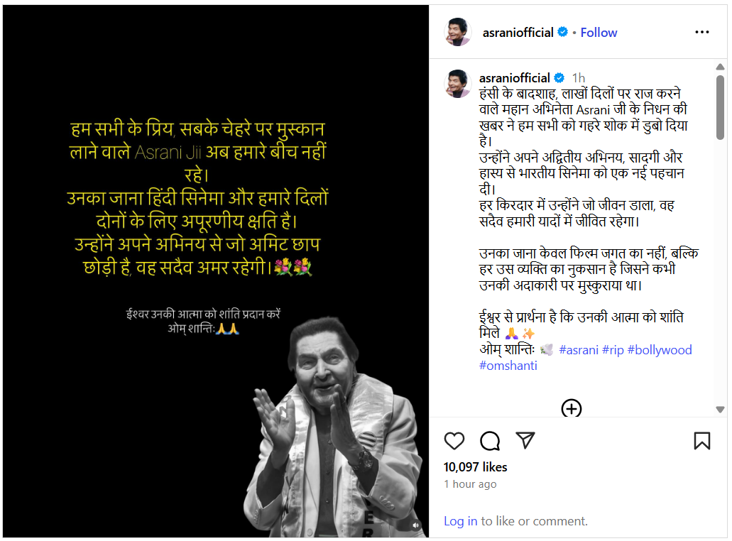 “The news of the passing of the king of comedy, the great actor Asrani ji, who ruled over millions of hearts, has plunged us all into deep sorrow. He gave Indian cinema a new identity with his unique acting, simplicity, and humor. The life he breathed into every character will forever live on in our memories. His passing is not just a loss for the film industry, but for everyone who ever smiled at his acting. May his soul rest in peace. Om Shanti.”