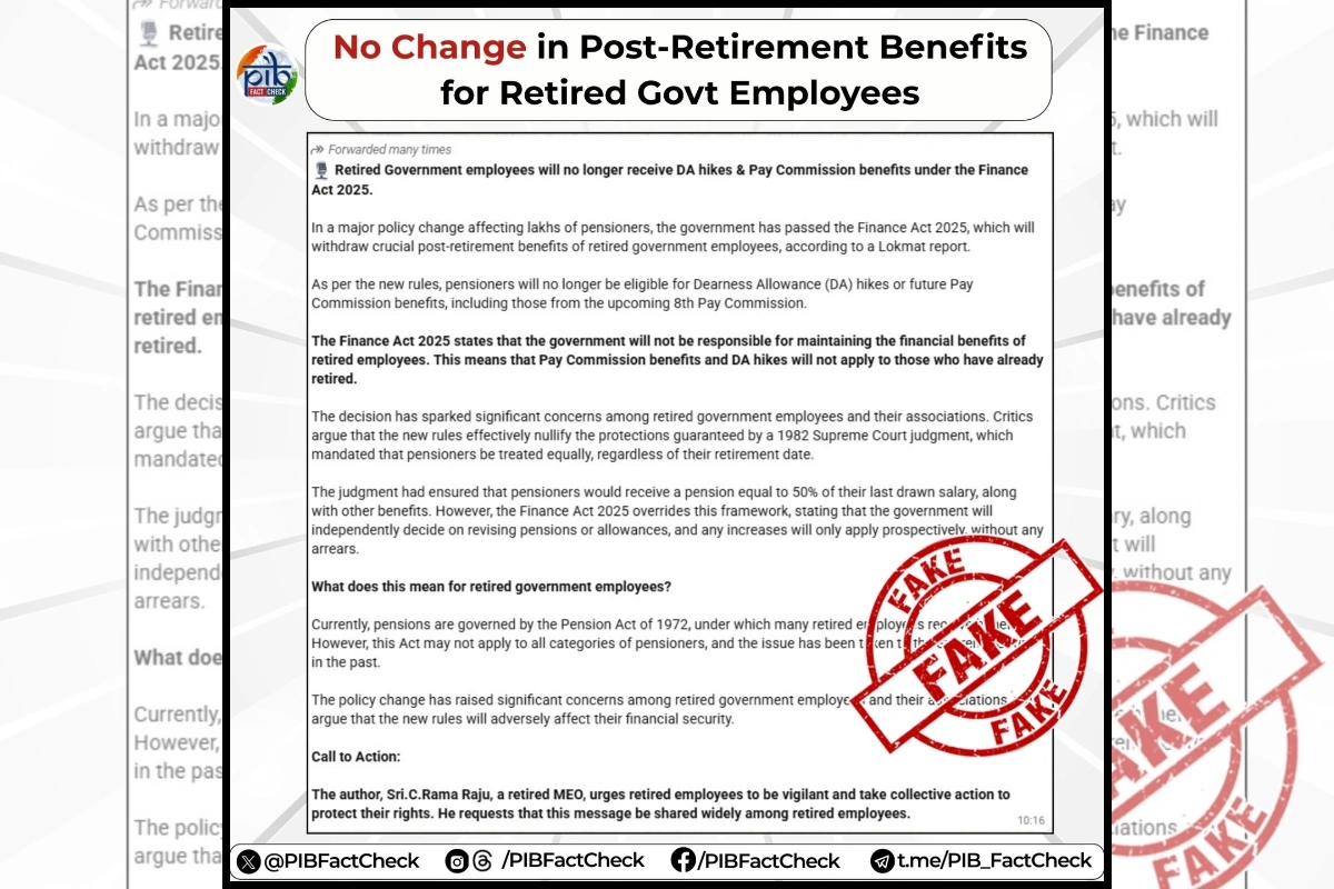 The PIB Fact Check team has debunked a viral WhatsApp message claiming that the Finance Act 2025 withdraws Dearness Allowance (DA) hikes and Pay Commission benefits for all retired government employees.