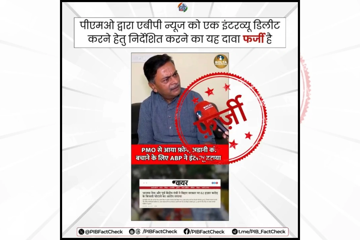 The Press Information Bureau’s Fact Check unit declared as fake a video circulating on social media that alleges the Prime Minister’s Office (PMO) instructed private broadcaster ABP News to remove an interview.