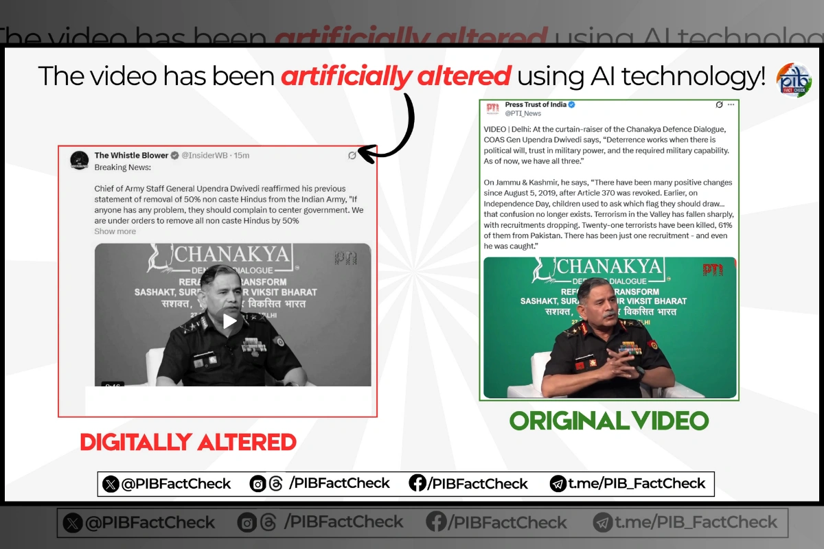 The Press Information Bureau’s Fact Check unit has issued a strong warning over a digitally manipulated video circulating on social media, falsely showing Chief of the Army Staff General Upendra Dwivedi making inflammatory claims about the removal of non-caste Hindu soldiers from the Indian Army.