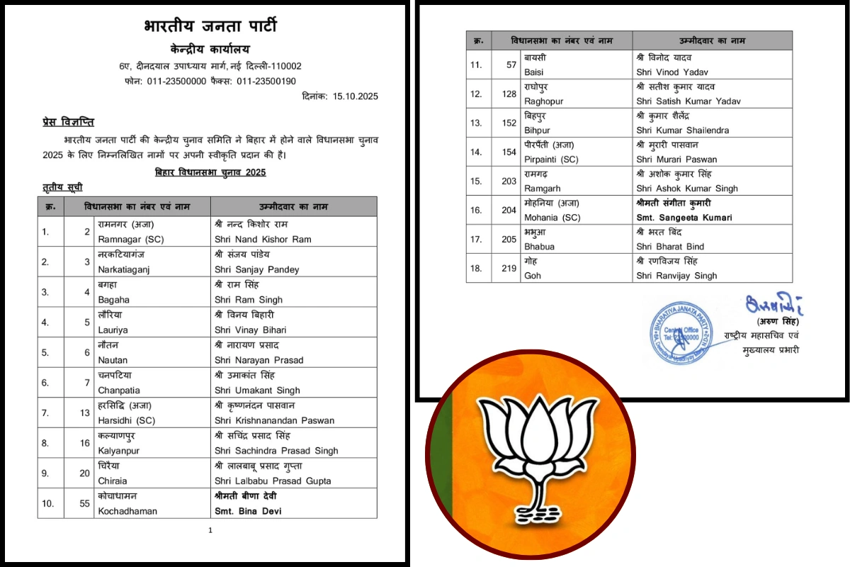 The Bharatiya Janata Party has completed its line-up for the Bihar Assembly elections, issuing a final list of 18 names and bringing its total to 101 candidates, its full share under the NDA’s seat-sharing deal.
