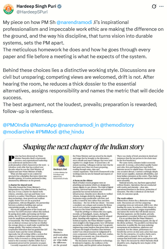 “My piece on how PM Sh @narendramodi Ji’s inspirational professionalism and impeccable work ethic are making the difference on the ground, and the way his discipline, that turns vision into durable systems, sets the PM apart,” Puri wrote on X.