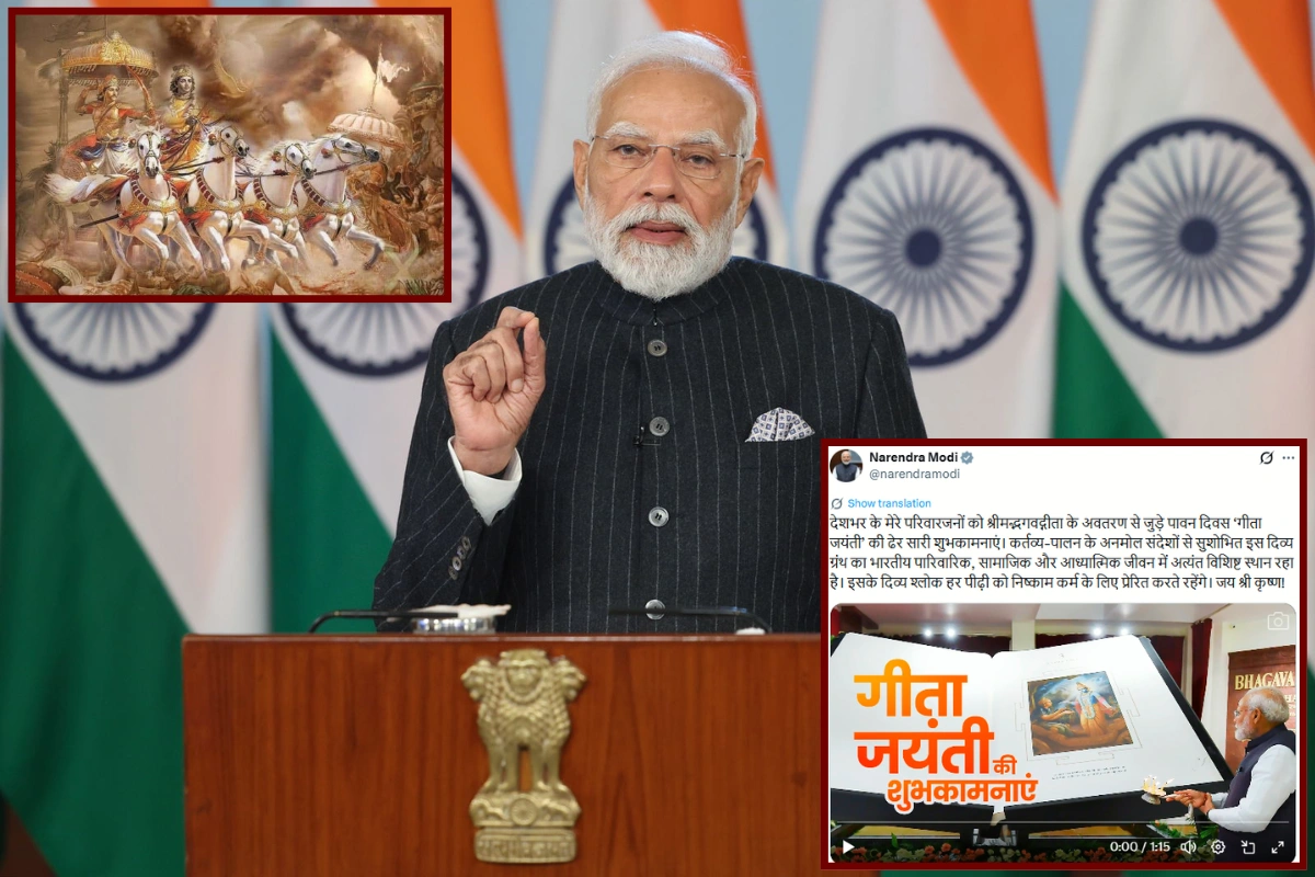 Prime Minister Narendra Modi on Monday extended greetings to citizens on the occasion of Gita Jayanti. He called the Bhagavad Gita a divine scripture that continues to guide generations with its timeless message of duty and selfless action.
