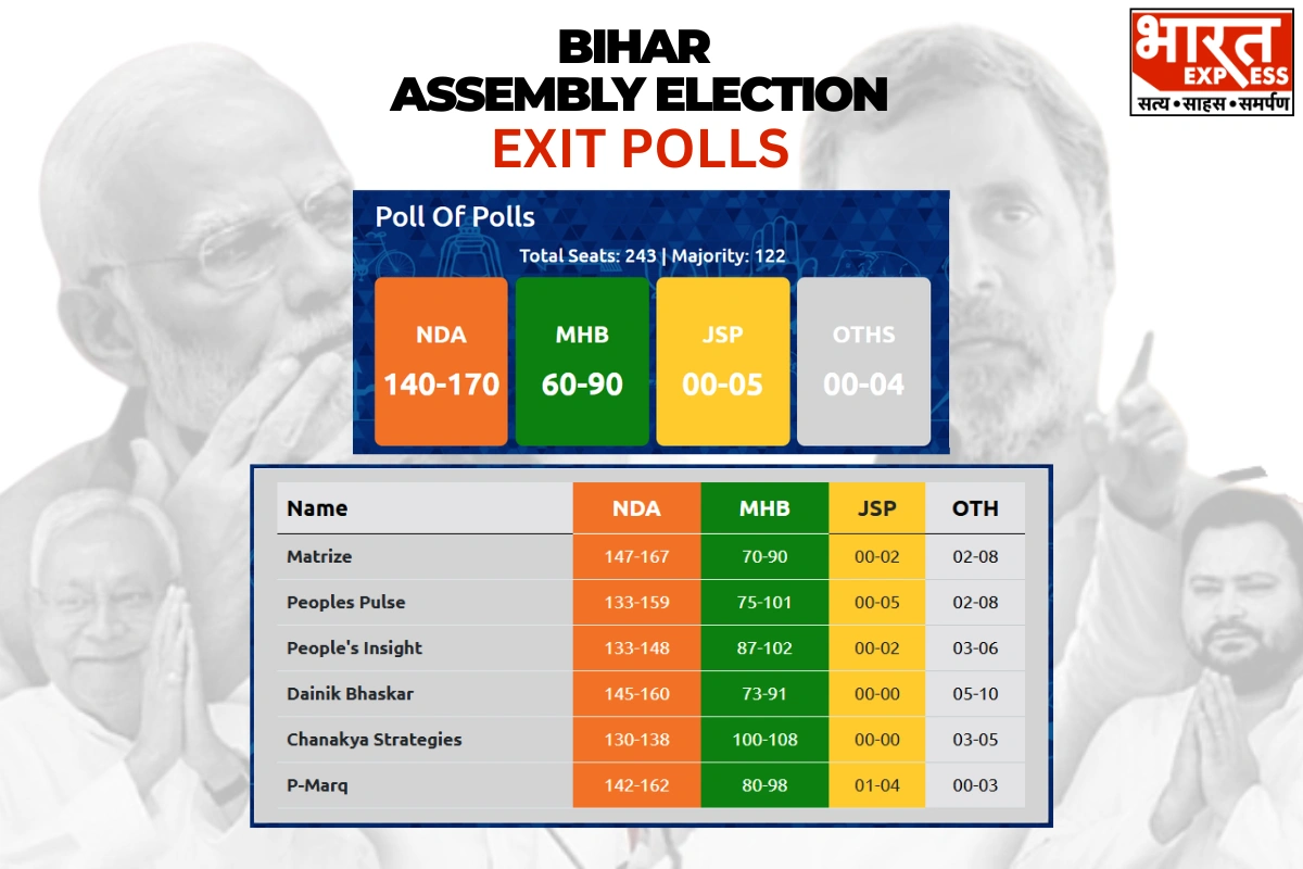 All major exit polls released Tuesday project the BJP-led National Democratic Alliance (NDA) to secure a sweeping victory in the 2025 Bihar Assembly elections.