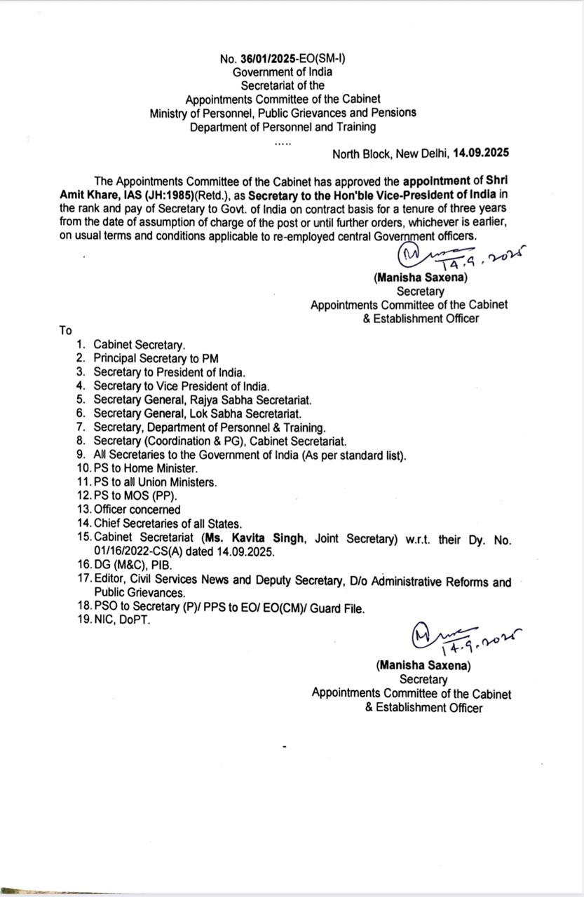 The Appointments Committee of the Cabinet (ACC) on Sunday approved the appointment of retired IAS officer Amit Khare as secretary to Vice-President CP Radhakrishnan.