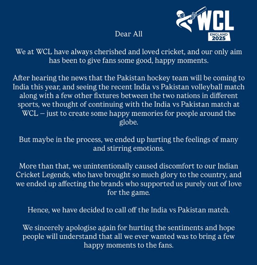 The highly anticipated India vs Pakistan encounter in the ongoing World Championship of Legends (WCL) has been officially cancelled, following strong resistance from Indian players and one of the tournament’s primary sponsors.