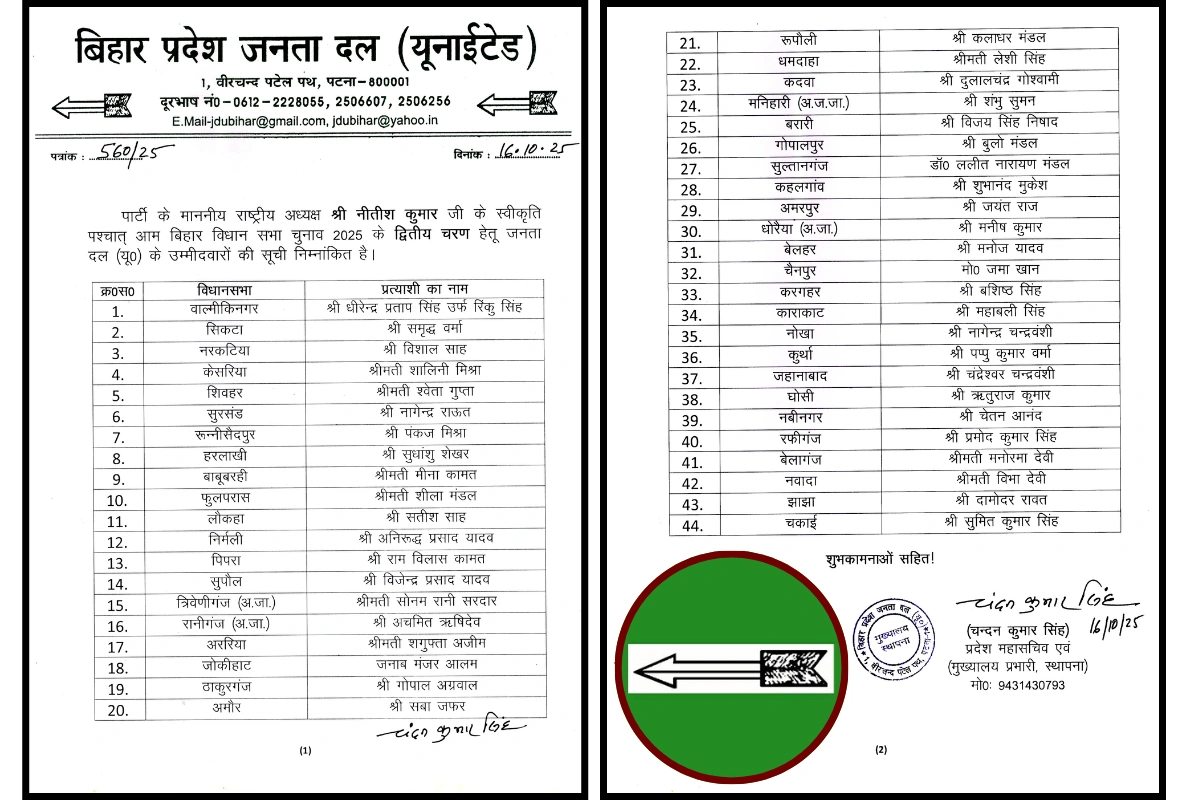 Stepping up its campaign for the 2025 Bihar Assembly elections, the Janata Dal (United) on Thursday released its second list of 44 candidates, blending political veterans with emerging leaders to present a socially inclusive front.