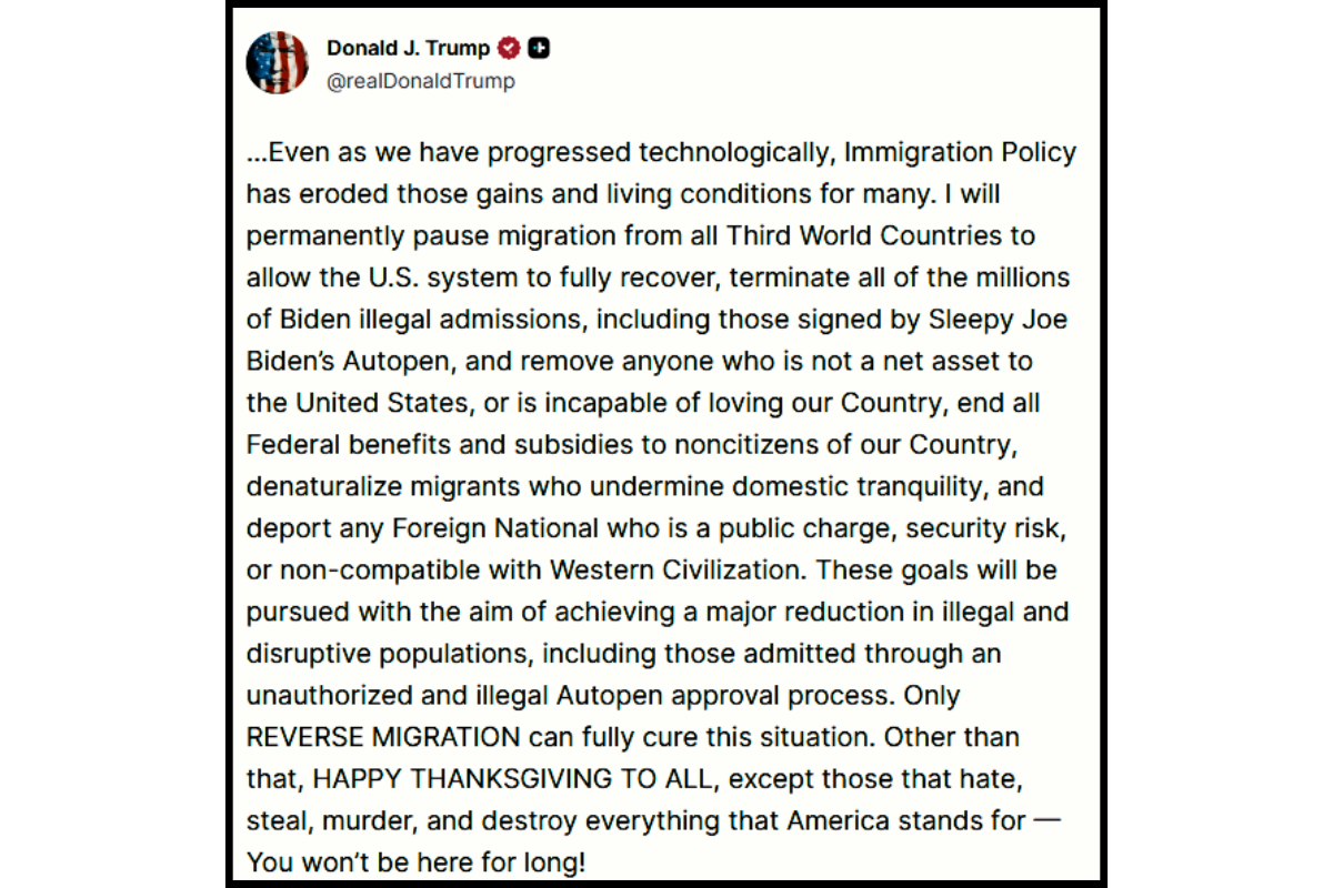 “I will permanently pause migration from all Third World Countries to allow the U.S. system to fully recover, terminate all of the millions of Biden illegal admissions, including those signed by Sleepy Joe Biden’s Autopen, and remove anyone who is not a net asset to the United States, or is incapable of loving our Country, end all Federal benefits and subsidies to noncitizens of our Country, denaturalize migrants who undermine domestic tranquility, and deport any Foreign National who is a public charge, security risk, or non-compatible with Western Civilization,” he wrote.