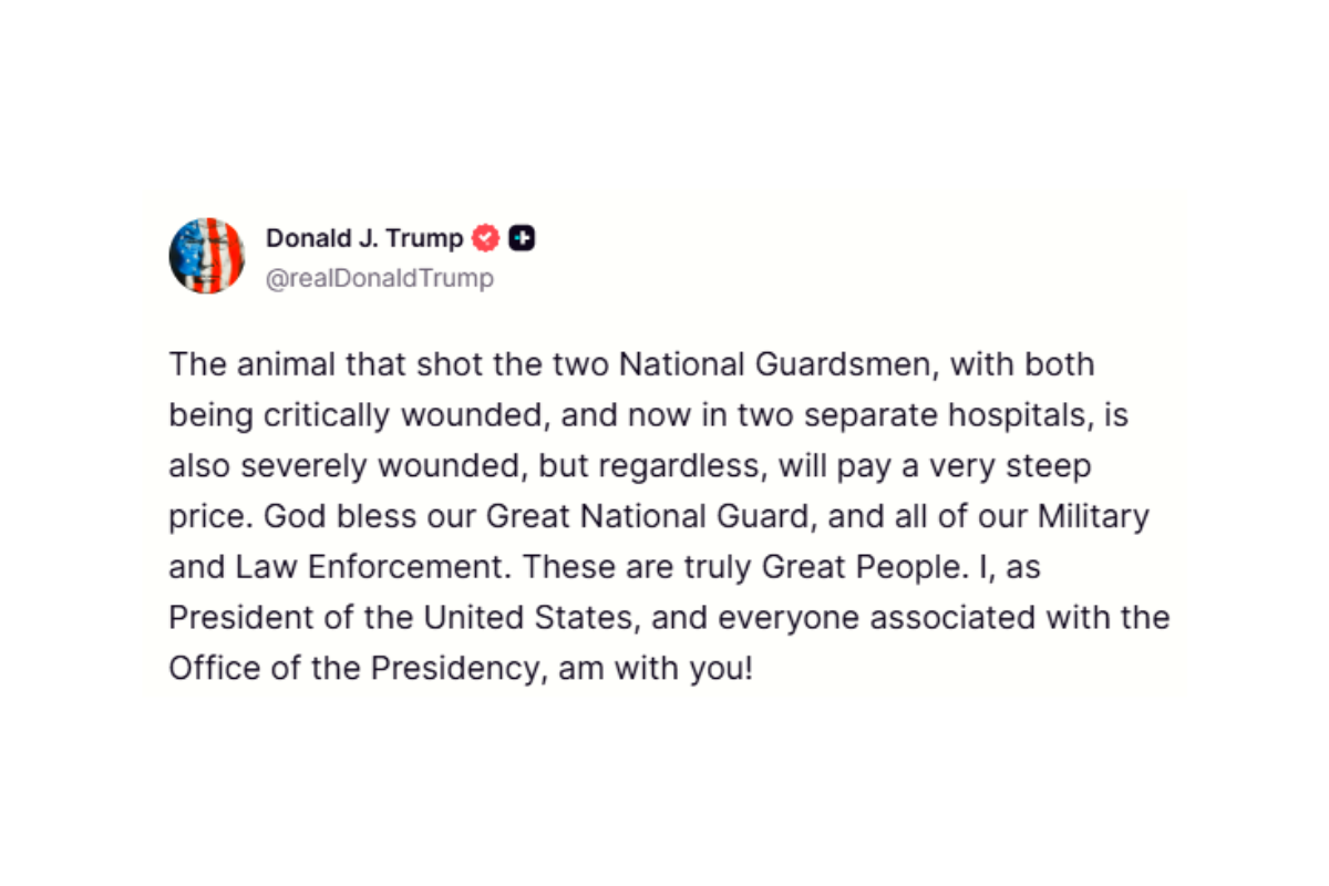 After the incident, Trump took to Truth Social, stating, “The animal that shot the two National Guardsmen, with both being critically wounded, and now in two separate hospitals, is also severely wounded, but regardless, will pay a very steep price. God bless our Great National Guard, and all of our Military and Law Enforcement. These are truly Great People. I, as President of the United States, and everyone associated with the Office of the Presidency, am with you!”